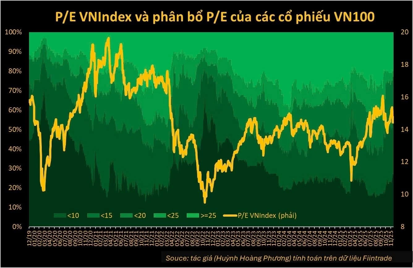 Quan sát phân bổ định giá P/E của các cổ phiếu trong VN100 theo góc nhìn equal-weighted từ năm 2020 đến nay cho thấy một số điểm đáng chú ý. Dù P/E của VN-Index hiện ở mức trung bình và chưa thể coi là rẻ, số lượng cổ phiếu có P/E dưới 10 hoặc dưới 15 lần đang tiệm cận các giai đoạn thị trường có P/E quanh 13,5 lần, vốn là những giai đoạn khá thuận lợi cho tích sản.