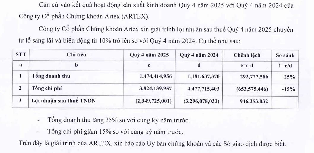 Trong quý IV/2025, doanh thu hoạt động của Artex đạt 1,45 tỷ đồng, chủ yếu từ nghiệp vụ lưu ký chứng khoán với 1,3 tỷ đồng. Hoạt động môi giới chứng khoán ghi nhận 103 triệu đồng, trong khi mảng tư vấn tài chính đạt 10 triệu đồng. Dù doanh thu cải thiện đáng kể so với nền thấp cùng kỳ, công ty vẫn chịu lỗ sau thuế khoảng 2,35 tỷ đồng trong quý IV.