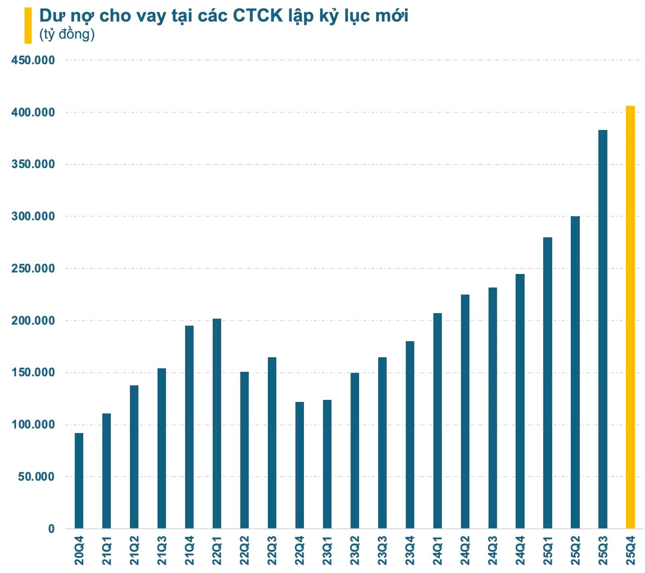 Các CTCK khác như TCBS, Vietcap, ACBS, BSC cũng ghi nhận mức tăng hàng nghìn tỷ trong quý 4/2025. TCBS tiếp tục giữ vị trí dẫn đầu ngành với dư nợ gần 44.000 tỷ đồng, đồng thời IPO thành công 231 triệu cổ phiếu, huy động 10.800 tỷ, nâng vốn điều lệ lên trên 23.000 tỷ đồng.
