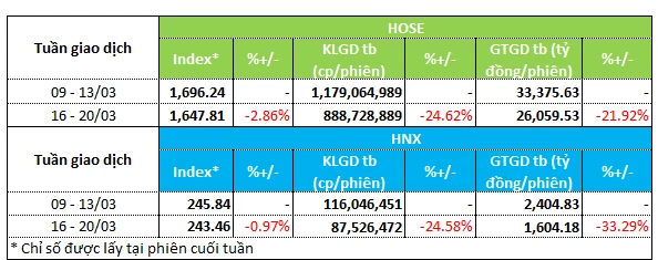 Thị trường chứng khoán kéo dài diễn biến tiêu cực sang tuần 16 - 20/03, điểm số và thanh khoản thị trường đều sụt giảm đáng kể. VN-Index giảm gần 3% về mức 1,647.81 điểm. Trong khi đó, HNX-Index giảm gần 1% còn 243.46 điểm. Tính tới 20/03, VN-Index đã đánh mất hơn 230 điểm kể từ đầu tháng.