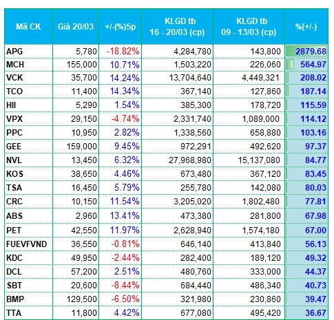Top 20 mã có thanh khoản tăng/giảm cao nhất sàn HOSE