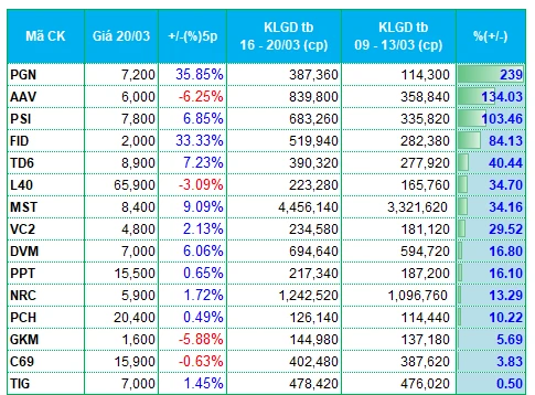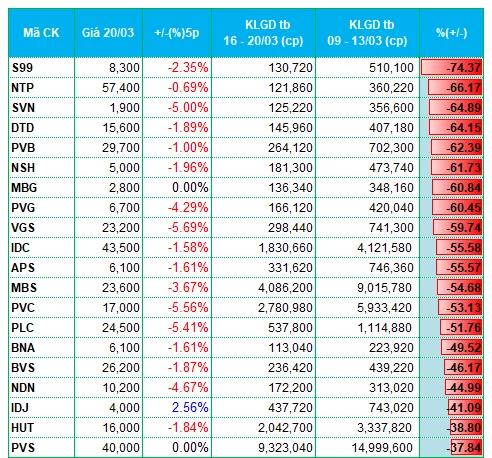 Top 20 mã có thanh khoản tăng/giảm cao nhất sàn HNX
