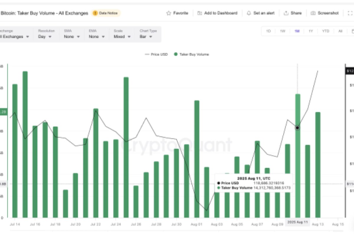 Khối lượng Mua Taker; tổng giá trị danh nghĩa của các lệnh mua thị trường nâng cao thanh khoản từ phía bán, đã tăng vọt lên 14.31 tỷ USD vào ngày 11/08/2025 trong một nỗ lực bứt phá thất bại. Đây là phần quan trọng — để một lệnh mua thị trường được thực hiện, nó phải “đánh” vào các lệnh bán đã có sẵn trên sổ lệnh. Vì vậy, mặc dù họ đang mua, họ đang làm điều đó ngay lập tức với giá của người bán, không chờ đợi một đợt giảm giá hoặc một thỏa thuận tốt hơn. Nói cách khác, khối lượng Mua Taker cao có nghĩa là người mua tích cực đang loại bỏ thanh khoản từ phía bán của sổ lệnh — họ đang nhanh chóng loại bỏ người bán, điều này có thể đẩy giá lên cao hơn nếu áp lực tiếp tục. Chỉ số này vẫn duy trì ở mức cao 12.24 tỷ USD, cho thấy các nhà giao dịch vẫn đang theo đuổi giá ở mức yêu cầu thay vì chờ đợi các đợt giảm giá.