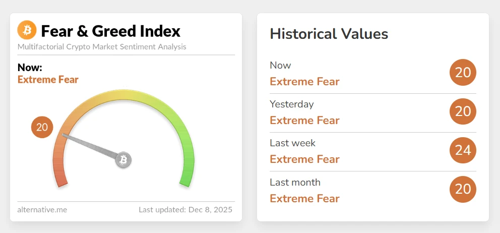 Chỉ số Sợ hãi & Tham lam (Fear & Greed Index) ngày 8/12 tiếp tục dừng ở mức 20 điểm, duy trì trong vùng “Extreme Fear”.