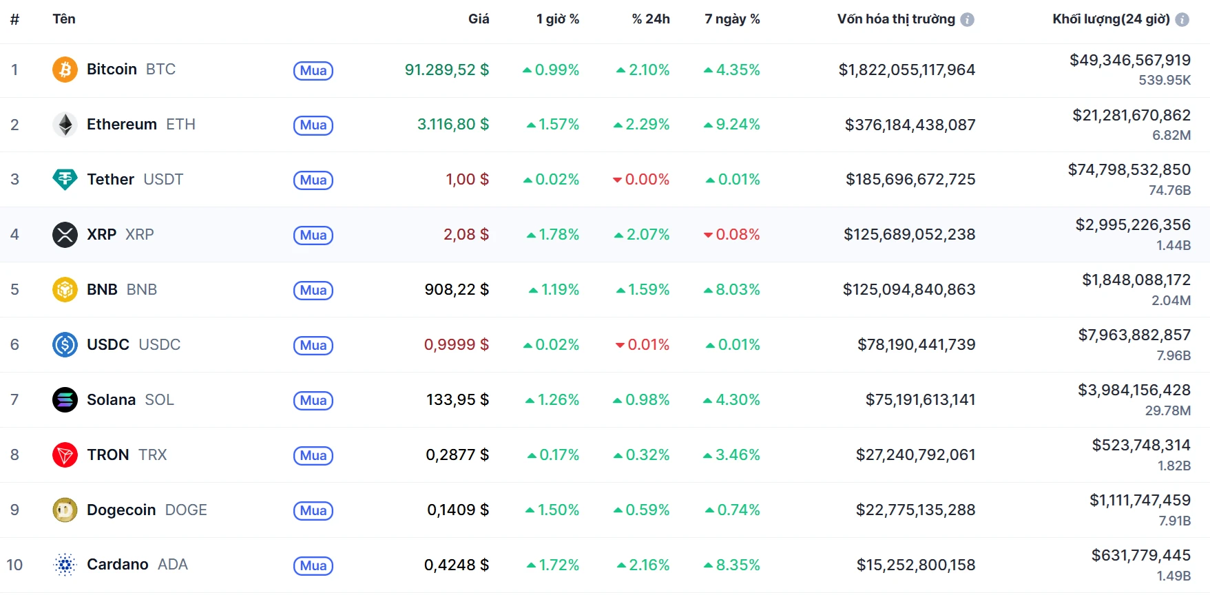 BNB tiếp tục xu hướng ổn định với mức tăng 1,59% lên 908 USD, đưa chuỗi tăng tuần lên hơn 8%. XRP cũng khởi sắc khi giao dịch quanh 2,08 USD, tăng 2,07%, còn Solana (SOL) dần lấy lại cân bằng sau đợt điều chỉnh mạnh trước đó, tăng gần 1% lên 133,95 USD.