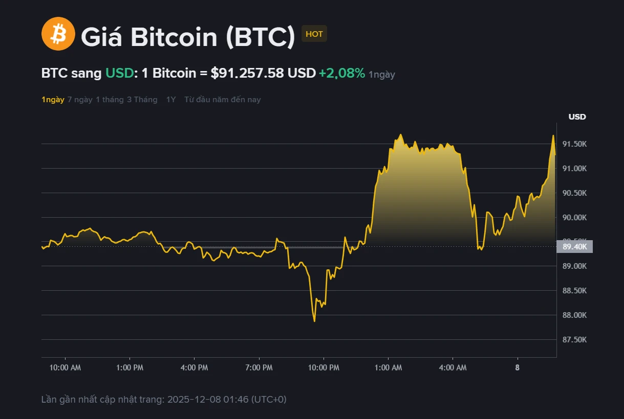 Ghi nhận sáng 8/12, Bitcoin được giao dịch quanh 91.250 USD với vốn hóa đạt khoảng 1.820 tỉ USD. Khối lượng giao dịch 24 giờ đạt gần 50 tỉ USD, phản ánh lực mua – bán giằng co mạnh trong phiên 7.12, khi BTC biến động từ 87.700 USD lên 91.700 USD.