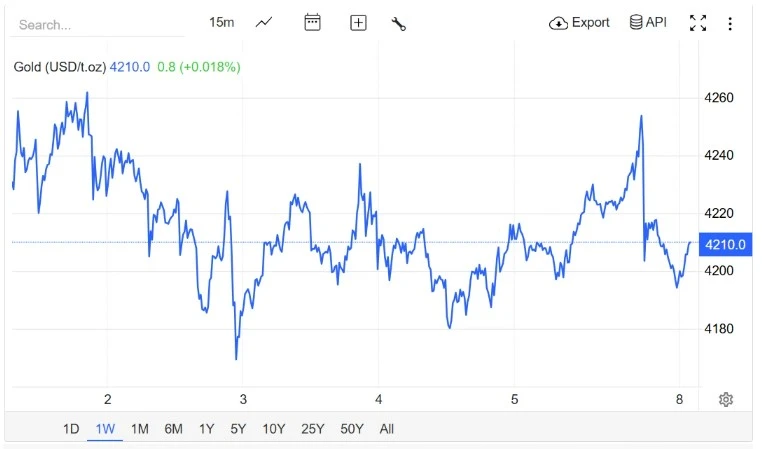 Giá vàng thế giới giao ngay trên thị trường châu Á lúc 7 giờ 45 sáng 8/12 (giờ Việt Nam) giao dịch quanh 4.210 USD/ounce, tăng 14 USD so với chốt phiên tuần trước. Giá vàng đang xây dựng mức cơ sở mới quanh 4.200 USD/ounce, phản ánh tâm lý thận trọng của thị trường trước các quyết định chính sách tiền tệ sắp tới từ Cục Dự trữ Liên bang Mỹ (Fed).