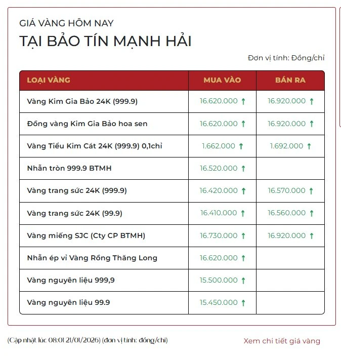 Trong bối cảnh thị trường "dậy sóng", hệ thống Bảo Tín Mạnh Hải đã có những đợt điều chỉnh giá dồn dập trong 24 giờ qua. Ghi nhận vào sáng ngày 21/1/2026, giá vàng tại đây đã thiết lập mặt bằng giá mới, cho thấy sức mua và tâm lý kỳ vọng của người dân đang ở mức rất cao.