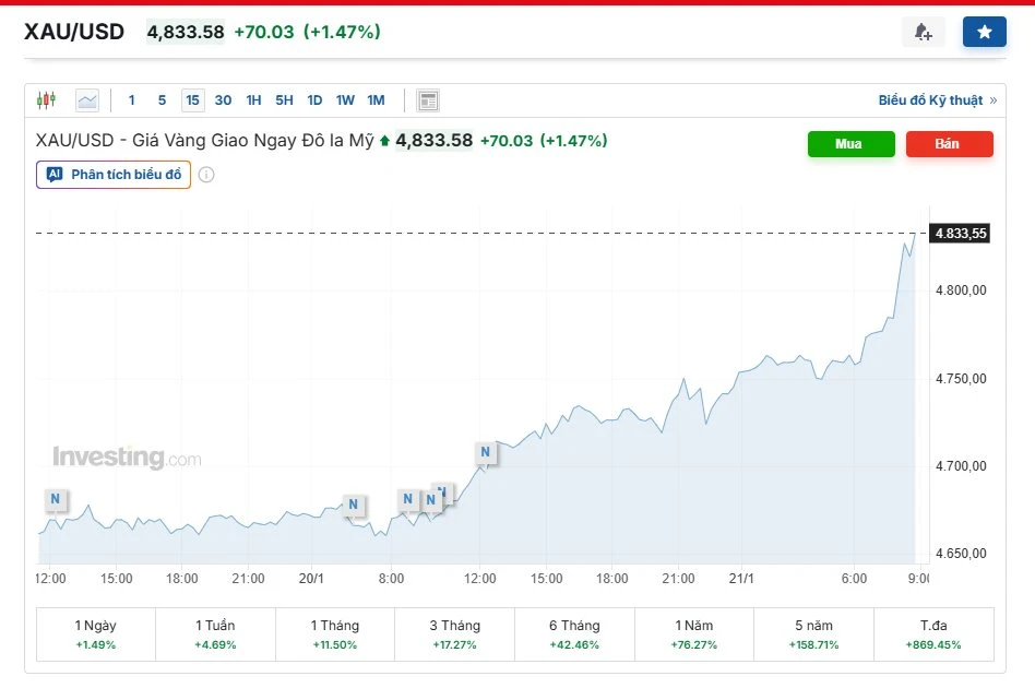 Sau khi chốt phiên giao dịch ngày 20/1 (giờ Mỹ) ở mức tăng dựng đứng, giá vàng giao ngay đã tiếp tục đà hưng phấn trong sáng ngày 21/1. Theo dữ liệu từ Kitco và Reuters, kim loại quý này đã có thời điểm vọt lên đỉnh cao kỷ lục mới tại 4.837 USD/ounce. Chỉ tính riêng từ đầu năm 2026 đến nay, vàng đã tăng thêm 10%, nối tiếp đà tăng trưởng 64% của năm 2025.
