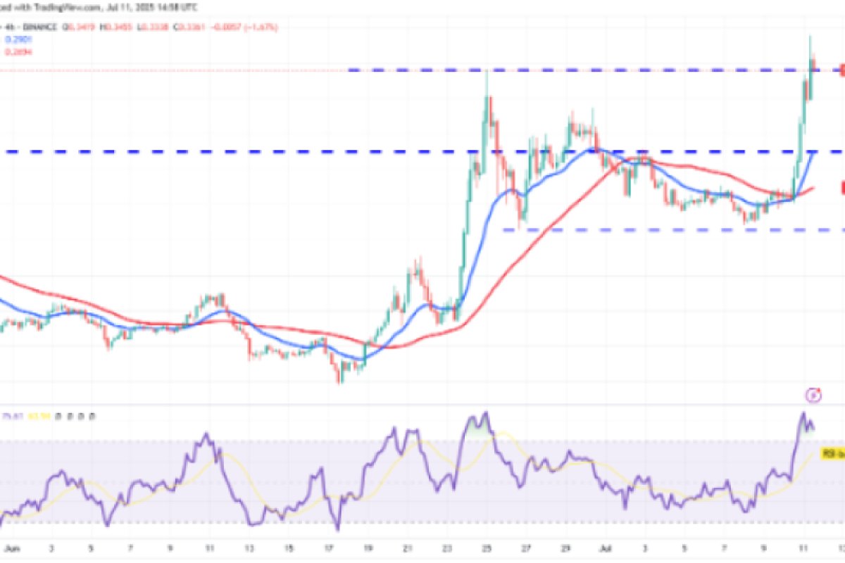Đường EMA 20 ngày dốc lên và chỉ báo RSI nằm trong vùng quá mua báo hiệu lợi thế cho người mua. Việc đóng cửa trên ngưỡng kháng cự 0,34 đô la có thể khởi đầu cho đợt tăng giá tiếp theo hướng tới 0,44 đô la.