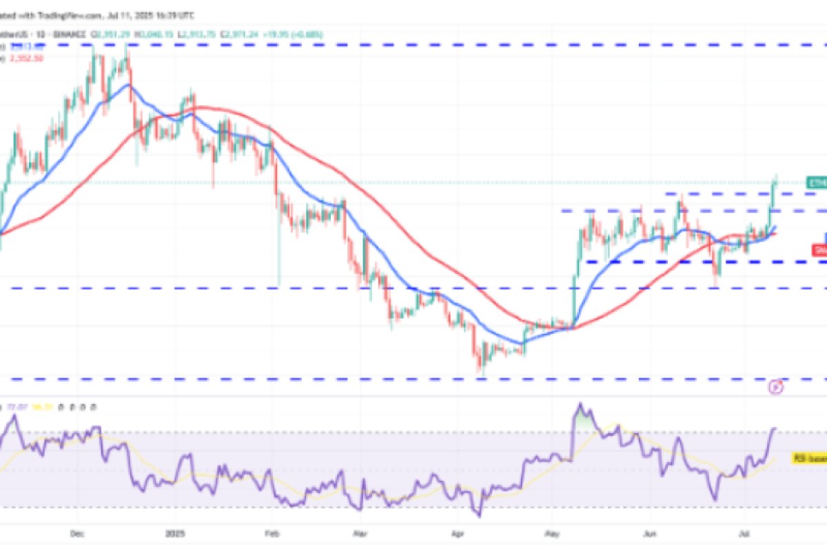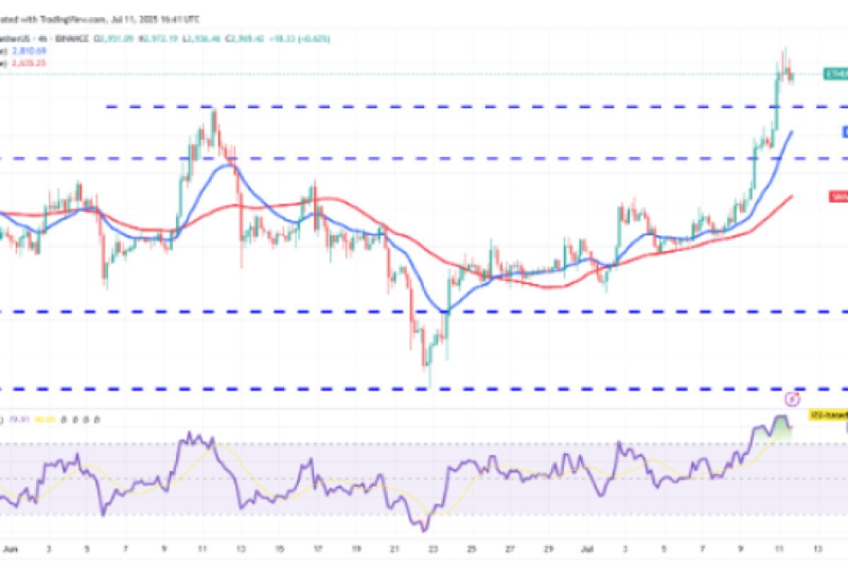 Đường EMA 20 ngày đã tăng lên, và chỉ báo RSI đang ở vùng quá mua, cho thấy phe mua đang chiếm ưu thế. Có một ngưỡng kháng cự nhỏ ở mức 3.153 đô la, nhưng nếu vượt qua được ngưỡng này, cặp ETH/USDT có thể tăng lên 3.400 đô la và sau đó là 3.750 đô la.