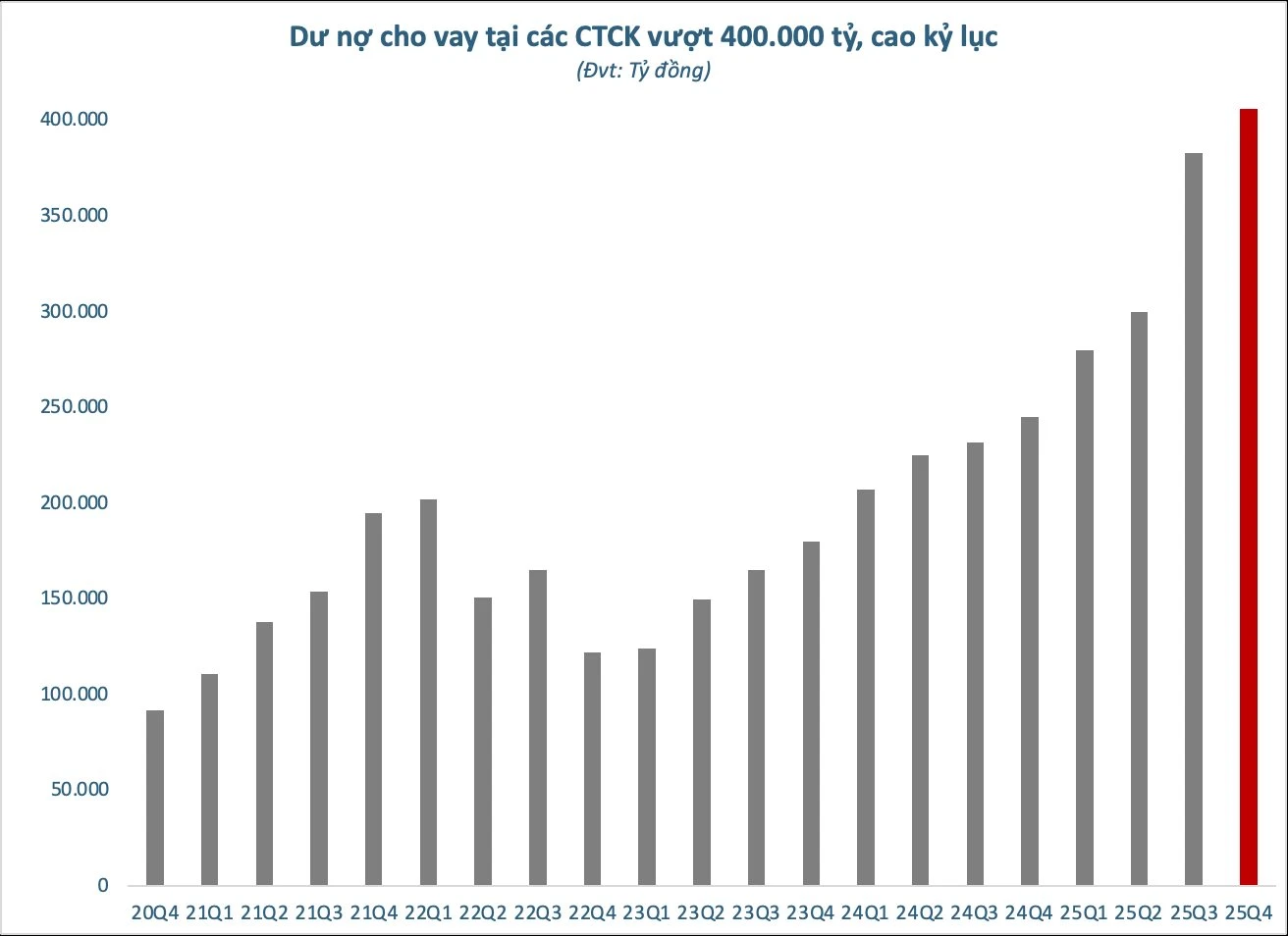Theo thống kê, tính đến cuối quý 4/2025, dư nợ cho vay (bao gồm margin và ứng trước tiền bán) tại các công ty chứng khoán ước tính vào khoảng 406.000 tỷ đồng (~15,6 tỷ USD), tăng khoảng 23.000 tỷ so với cuối quý 3 trước đó và là mức cao kỷ lục từ trước đến nay.