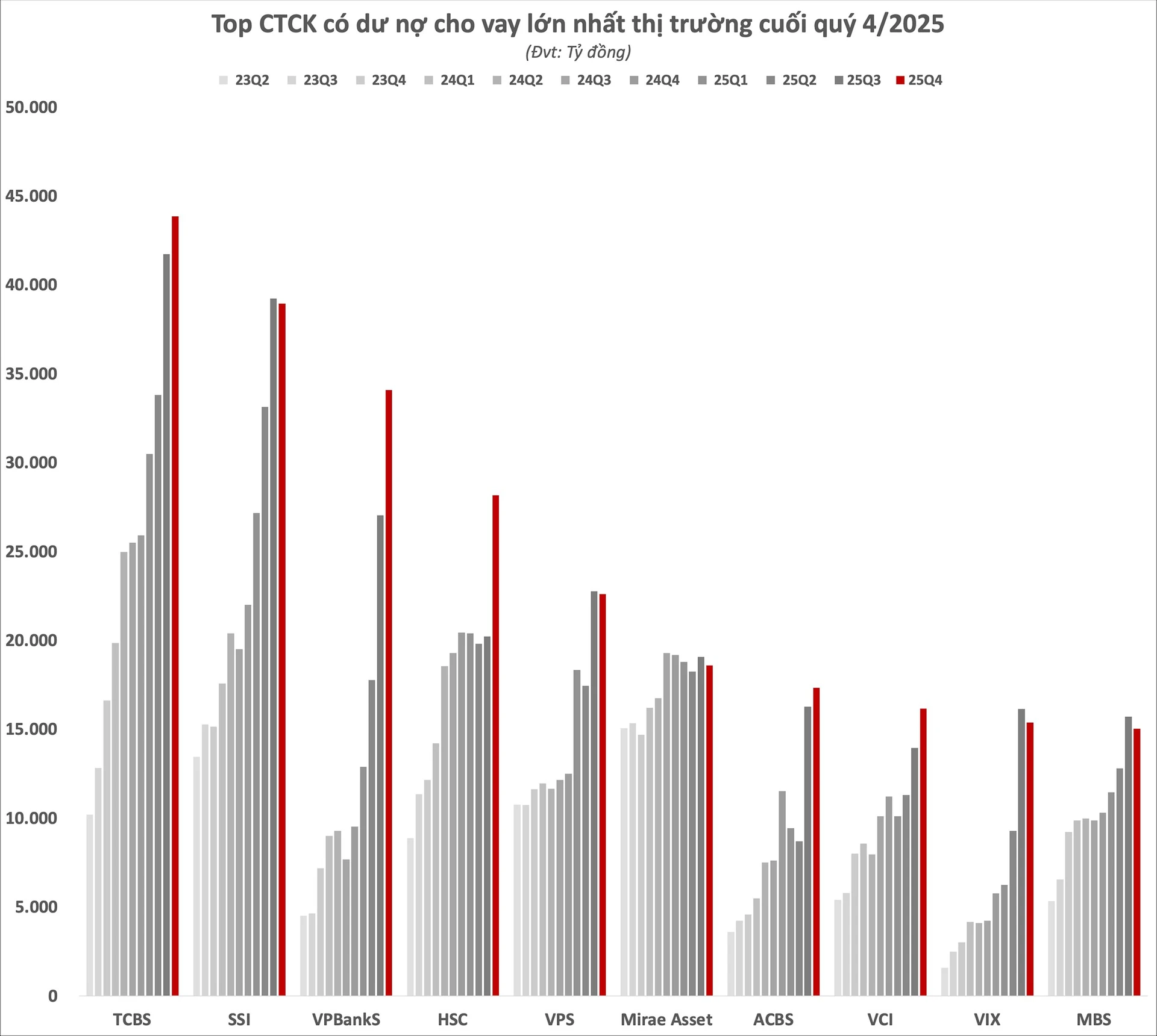 Tính đến cuối năm 2025, toàn thị trường có 15 CTCK ghi nhận dư nợ cho vay trên 10.000 tỷ, xác lập kỷ lục mới. Trong đó LPBankS là tân binh mới nhất với dư nợ tăng vọt hơn 7.000 tỷ trong quý 4 vừa qua, đạt 10.548 tỷ đồng.