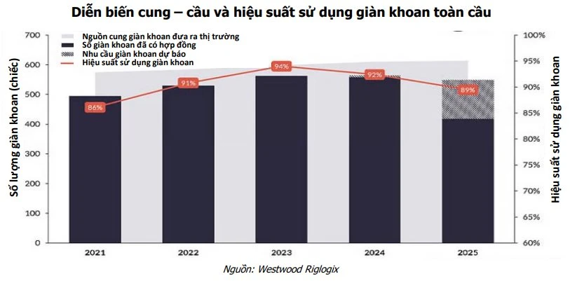 Tình hình nguồn cung giàn khoan toàn cầu cho thấy bức tranh ổn định, sau khi đạt đỉnh hơn 2.000 giàn vào năm 2024, số lượng giàn khoan trên thế giới giảm xuống hơn 1.800 giàn trong năm 2025. Ở nhóm OECD, đặc biệt tại Mỹ, số giàn khoan giảm hơn 20% so với năm 2022, hiện dao động quanh hơn 500 giàn, trong khi các quốc gia khác ở Châu Âu, Châu Á – Thái Bình Dương hay Canada không ghi nhận gia tăng đáng kể. Tại OPEC, số lượng giàn khoan duy trì ổn định quanh mức 600 giàn, thể hiện chiến lược thận trọng nhằm tránh tạo dư cung mới. Hiệu suất sử dụng giàn khoan toàn cầu duy trì ở mức cao 89-92%, cho thấy nhu cầu giàn khoan vẫn tích cực trong 1-2 năm tới.