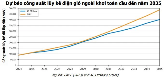 Trong dài hạn, Agriseco Research đánh giá điện gió ngoài khơi sẽ trở thành động lực tăng trưởng quan trọng cho nhóm thượng nguồn. Dự báo của 4C Offshore và BloombergNEF cho thấy công suất lắp đặt điện gió ngoài khơi toàn cầu sẽ vượt mốc 200 GW trước năm 2030 và đạt từ 400 GW đến gần 480 GW vào năm 2035. Riêng khu vực châu Á – Thái Bình Dương, tổng công suất lắp đặt điện gió ngoài khơi dự kiến tăng mạnh đến năm 2050, với Việt Nam trở thành điểm sáng nổi bật, đặt mục tiêu đạt khoảng 6 GW vào 2030, 15 GW vào 2035 và 30 GW tới năm 2050. Lợi thế địa lý với đường bờ biển dài hơn 3.260 km, tốc độ gió mạnh và ổn định, đặc biệt ở Nam Trung Bộ và Vịnh Bắc Bộ, giúp Việt Nam vừa đáp ứng nhu cầu năng lượng trong nước vừa hướng tới trở thành trung tâm phát triển năng lượng tái tạo trong khu vực.