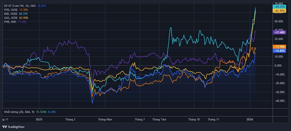 Trên sàn chứng khoán, nhóm cổ phiếu dầu khí đã bứt tốc mạnh mẽ trong khoảng một tháng gần đây, thu hút dòng tiền rõ nét. Đáng chú ý, GAS và BSR tăng dựng đứng khoảng 60%-70% chỉ sau một tháng, vươn lên vùng giá cao nhất từ trước tới nay, trong khi các mã như PVS, PVD cũng leo lên vùng đỉnh khoảng 1,5 năm, phản ánh tâm lý hưng phấn của nhà đầu tư với nhóm ngành này.