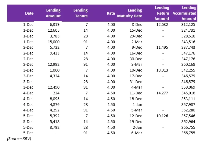 • Biến động lãi suất quan trọng: Tuy nhiên, lãi suất cho tất cả các kỳ hạn cho vay (từ 7 đến 91 ngày) đồng loạt tăng 50 điểm cơ bản (bps), lên 4,5%.