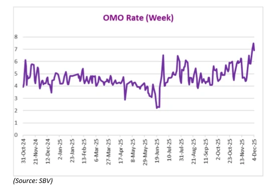Lãi suất OMO kỳ hạn 1 tuần đã tăng đáng kể, tăng 106 bps vào tuần trước. Điều này theo xu hướng chung, khi lãi suất đã tăng tổng cộng 249 bps trong hai tuần qua, phản ánh chi phí vốn liên ngân hàng tăng bất chấp sự hỗ trợ thanh khoản của Ngân hàng Nhà nước.