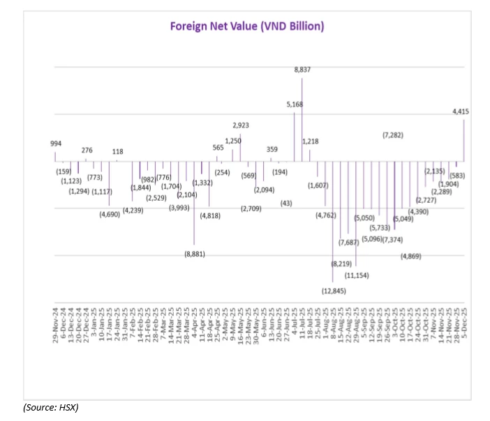 Nhà đầu tư nước ngoài bất ngờ chuyển sang mua ròng với tổng giá trị ròng đạt 4.475 tỷ đồng. Tuy nhiên, sự đảo chiều này chủ yếu đến từ một giao dịch lớn liên quan đến VPL và do đó không phản ánh sự thay đổi cơ bản trong dòng giao dịch chung của khối ngoại tại thời điểm này.