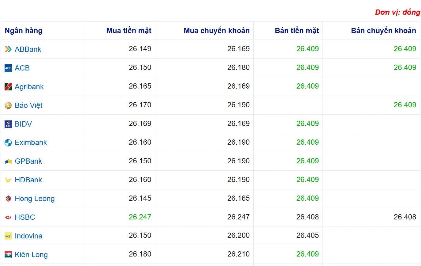Trên thị trường ngân hàng thương mại, lúc 8h18, Vietcombank niêm yết tỷ giá USD 26.172 - 26.412 VND/USD, tăng 3 đồng cả hai chiều so với hôm qua. BIDV điều chỉnh giảm 9 đồng giá mua và tăng 3 đồng giá bán, giao dịch ở mức 26.160 - 26.412 VND/USD.