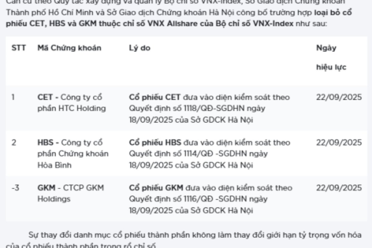 Căn cứ theo quy tắc xây dựng và quản lý bộ chỉ số VNX-Index, Sở Giao dịch Chứng khoán TPHCM (HOSE) và Sở Giao dịch Chứng khoán Hà Nội (HNX) công bố trường hợp loại bỏ cổ phiếu GKM, HBS và CET thuộc chỉ số VNX Allshare của bộ chỉ số VNX-Index.