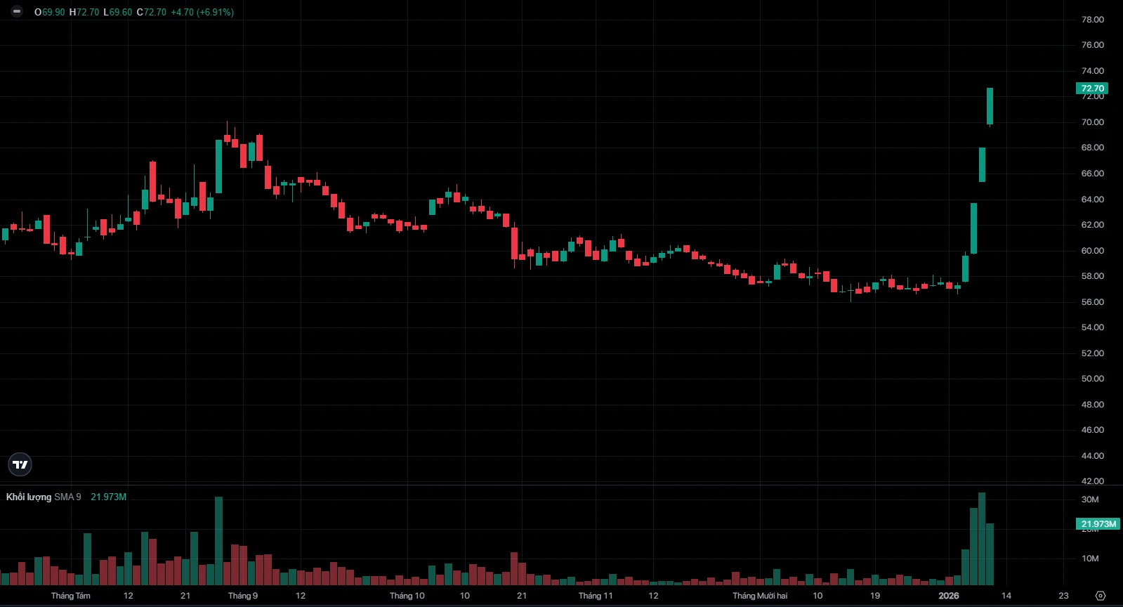Phiên 12/1 chứng kiến cổ phiếu lập đỉnh 72.700 đồng, tương ứng mức tăng trần 6,91%, nối dài chuỗi bứt phá liên tục với biên độ tăng giá 4–7% qua từng phiên, từ mức 57.500 đồng cuối tháng 12/2025 vượt qua các mốc 60.000, 65.000, 70.000 đồng chỉ trong chưa đầy một tuần.