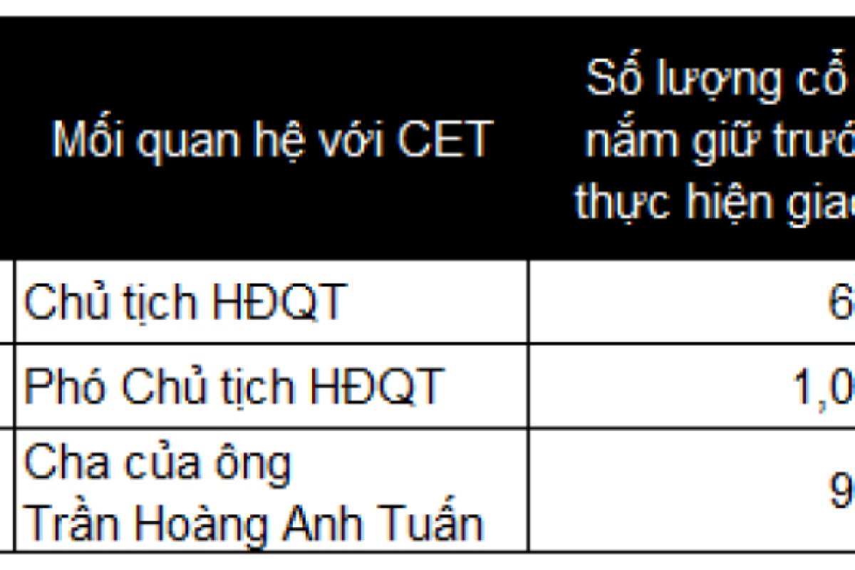 Đáng chú ý, trong khi giá cổ phiếu liên tục tăng và có nhiều phiên tăng trần, ngày 17/09, bà Bùi Thị Hải Yến đã bán thỏa thuận gần 1.2 triệu cp CET, hạ tỷ lệ sở hữu từ 22.26% xuống còn 3%, tương ứng 181,500 cp, và không còn là cổ đông lớn. Thương vụ mang về hơn 7.8 tỷ đồng, với mức giá bình quân 6,700 đồng/cp, thấp hơn khoảng 17% so với giá trần 8,100 đồng/cp trong cùng phiên. Không chỉ bà Yến, nhóm lãnh đạo CET gồm Phó Chủ tịch HĐQT Trần Hoàng Anh Tuấn đã đăng ký bán toàn bộ hơn 1 triệu cp nắm giữ (tỷ lệ 17.26%), Chủ tịch HĐQT Nguyễn Thế Tài muốn bán đứt 10% vốn, ông Trần Hoàng Cường - cha của ông Tuấn - cũng đăng ký thoái sạch 15.01% vốn. Cả 3 thương vụ được đăng ký trong giai đoạn 25/09-23/10. [caption id="attachment_3406" align="aligncenter" width="635"]