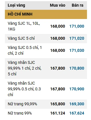 Cụ thể, Công ty SJC, Tập đoàn DOJI, PNJ cùng niêm yết giá vàng miếng SJC và vàng nhẫn trơn ở mức 168,0 – 171,0 triệu đồng/lượng, giảm 2,5 triệu đồng/lượng.