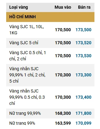 Tại Công ty SJC, giá vàng SJC ở mức 170,5 – 173,5 triệu đồng/lượng trong khi giá vàng nhẫn trơn là 170,3 – 173,3 triệu đồng/lượng.