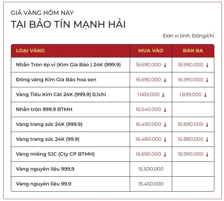 Tương tự tại Bảo Tín Mạnh Hải, giá vàng miếng SJC và vàng nhẫn trơn đều được niêm yết ở mức 166,9 – 169,9 triệu đồng/lượng.