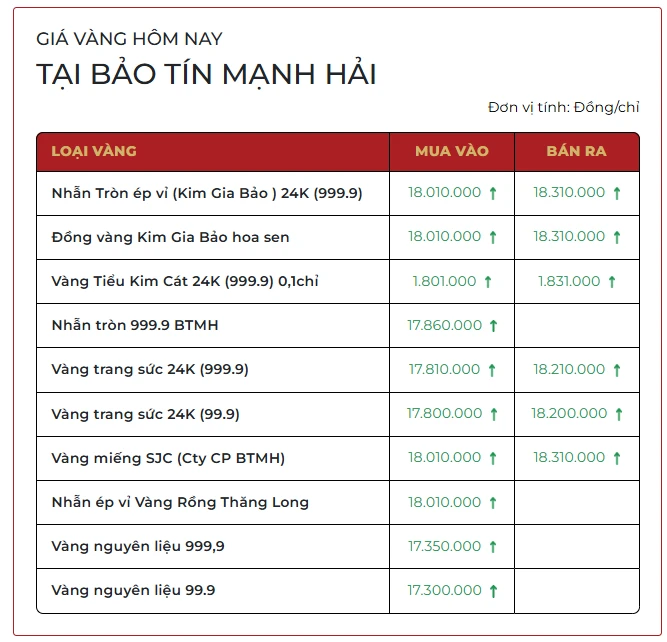 Tại Bảo Tín Mạnh Hải, giá vàng SJC và giá vàng nhẫn hiện ỏ mức 179,5 – 182,5 triệu đồng/lượng, giảm 2,5 triệu đồng/lượng. Giá vàng Tiểu Kim Cát 0,1 chỉ ở mức 1,795 – 1,825 triệu đồng/chỉ.