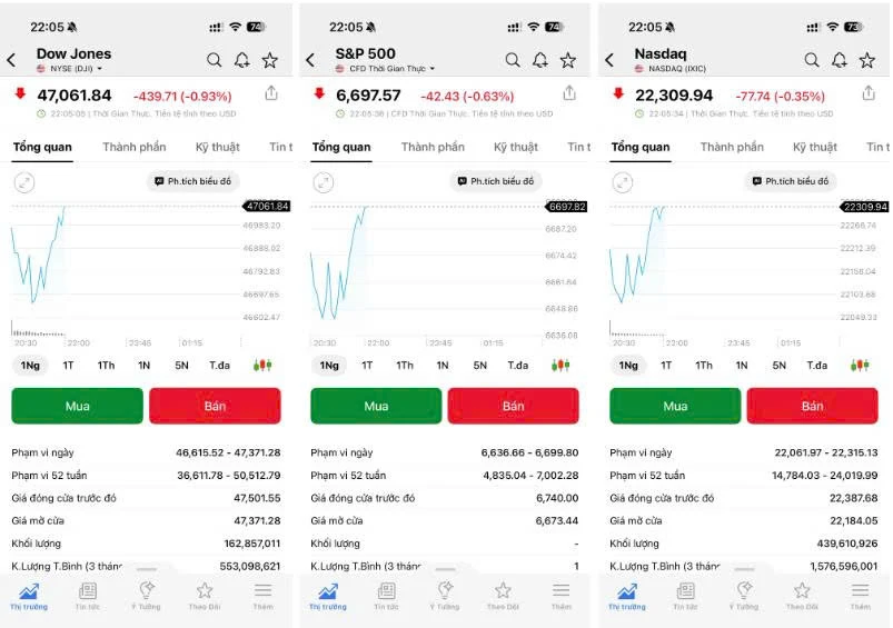 Trước đó, vào lúc 21h55 theo giờ Hà Nội, Dow Jones giảm 480 điểm xuống còn 47.021 điểm, phục hồi so với "đáy" 46.615 điểm, tương đương mức giảm lên tới 886 điểm. S&P 500 và Nasdaq cũng lần lượt giảm 0,7% và 0,4%, phục hồi so với mức giảm hồi đầu phiên.
