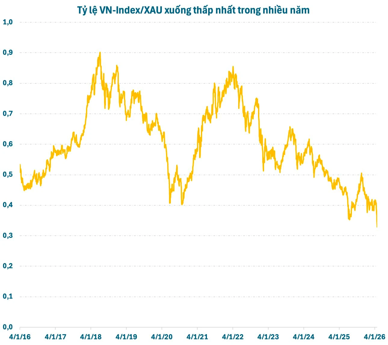 Chứng khoán tăng thua xa vàng, tỷ lệ VN-Index/XAU xuống thấp nhất trong hơn 1 thập kỷ