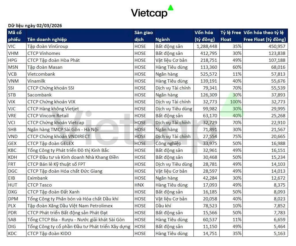 Danh sách các cổ phiếu Việt Nam đáp ứng tiêu chí sơ bộ của FTSE Global All Cap Index gồm: VIC, VHM, HPG, MSN, VCB, VNM, SSI, STB, VIX, VJC, VRE, VCI, SHB, VND, GEX, KBC, KDH, FRT, DGC, EIB, HUT, DXG, DPM, PLX, PDR, SAB, DIG và KDC.