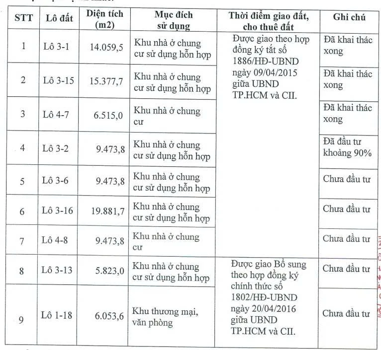 Theo thông tin từ CII, khi thực hiện dự án BT công ty được giao, cho thuê đất đối ứng 9 lô đất tại Thủ Thiêm. Trong đó, công ty đã đầu tư xong 3 lô đất, 1 lô đầu tư khoảng 90% và 5 lô chưa đầu tư.