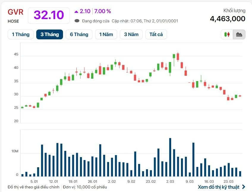 Trước đó, cổ phiếu GVR từng thiết lập đỉnh lịch sử tại 45.750 đồng/cổ phiếu vào đầu tháng 3. Tuy nhiên, ngay sau đó, cổ phiếu này liên tục “lao dốc” mạnh và chạm đáy ngắn hạn tại 28.600 đồng/cổ phiếu ở phiên 23/3, tương đương mức giảm gần 38% chỉ trong chưa đầy một tháng. Chính nhịp điều chỉnh sâu này đã mở ra cơ hội cho dòng tiền “bắt đáy” quay trở lại.