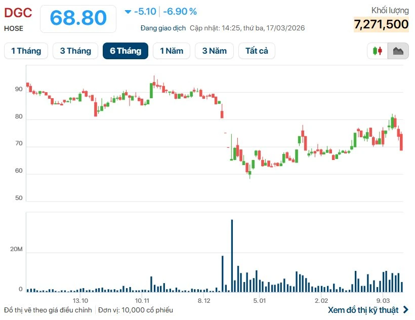 Phiên chiều 17/3, cổ phiếu DGC của Tập đoàn Hóa chất Đức Giang giảm kịch sàn xuống 68.800 đồng/cp, với dư bán sàn hơn 6,5 triệu đơn vị, thanh khoản vọt lên gần 7 triệu cổ phiếu. Áp lực bán gia tăng mạnh sau khi thông tin liên quan đến sai phạm tại doanh nghiệp này được cơ quan chức năng công bố.