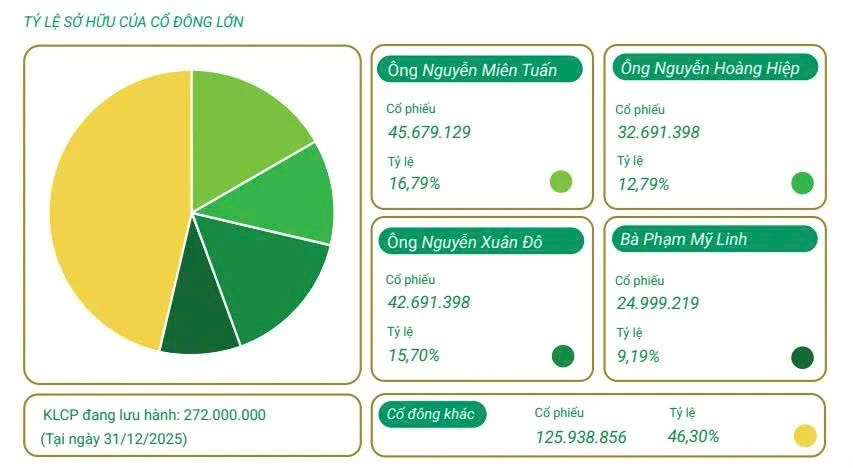 Nhiều năm qua, cơ cấu cổ đông của công ty chủ yếu do nhà đầu tư cá nhân sở hữu, bao gồm ông Nguyễn Miên Tuấn – Chủ tịch HĐQT nắm 16,79%, ông Nguyễn Hoàng Hiệp nắm 12,79%, ông Nguyễn Xuân Đô nắm 15,7% và bà Phạm Mỹ Linh (mẹ ruột Thành viên HĐQT Phạm Hữu Luân) nắm 9,19%.