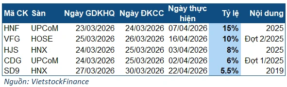 Các doanh nghiệp còn lại đều chốt chia cổ tức với tỷ lệ dưới 10%, gồm HJS, CDG, SD9. Tuần tới không có doanh nghiệp nào chốt chia cổ tức bằng cổ phiếu.