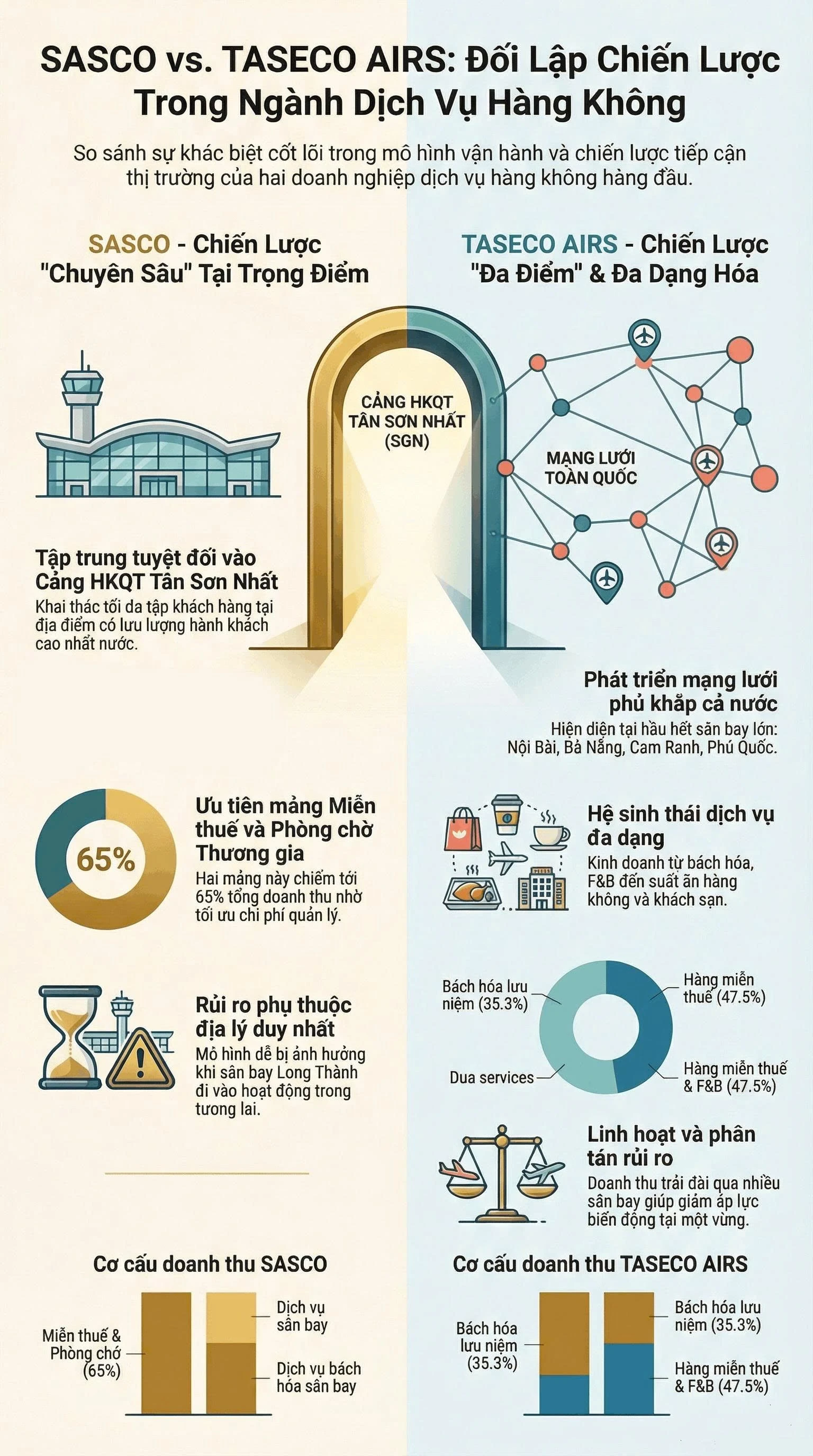 Trái ngược, Taseco Airs với việc hiện diện tại nhiều sân bay giúp doanh nghiệp này phân tán rủi ro địa lý. Trong 6 tháng đầu năm 2025, doanh thu của Taseco Airs chủ yếu đến từ sân bay Nội Bài (41%), Đà Nẵng (24%), Tân Sơn Nhất (16%), Phú Quốc (9%),...