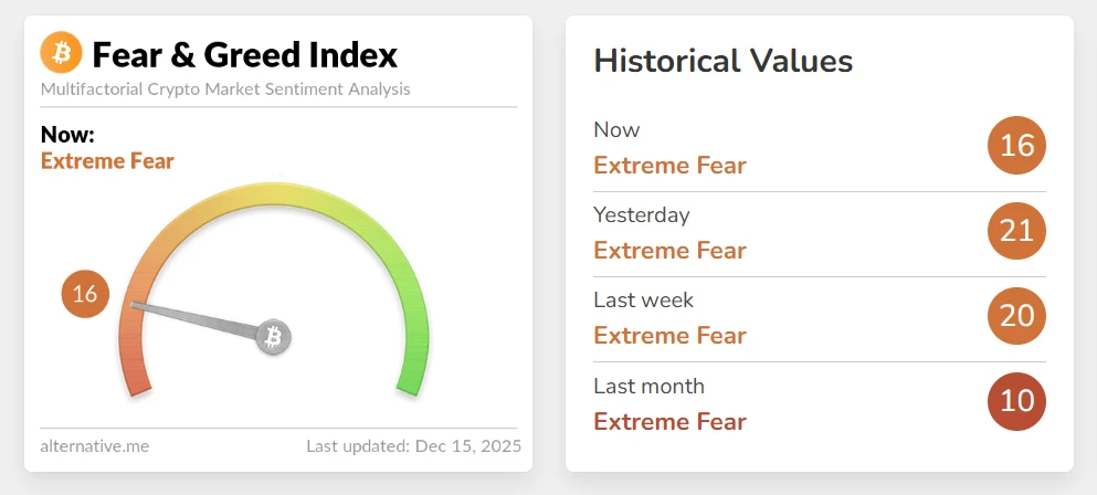 Một trong những yếu tố đáng chú ý nhất hiện nay là sự suy giảm mạnh của tâm lý nhà đầu tư. Chỉ số Sợ hãi & Tham lam (Fear & Greed Index) ngày 15/12 rơi xuống 16 điểm, tiếp tục nằm sâu trong vùng “sợ hãi tột độ”. So với những ngày trước đó, mức giảm này phản ánh rõ sự bi quan đang gia tăng khi Bitcoin chưa cho thấy tín hiệu ổn định trở lại.
