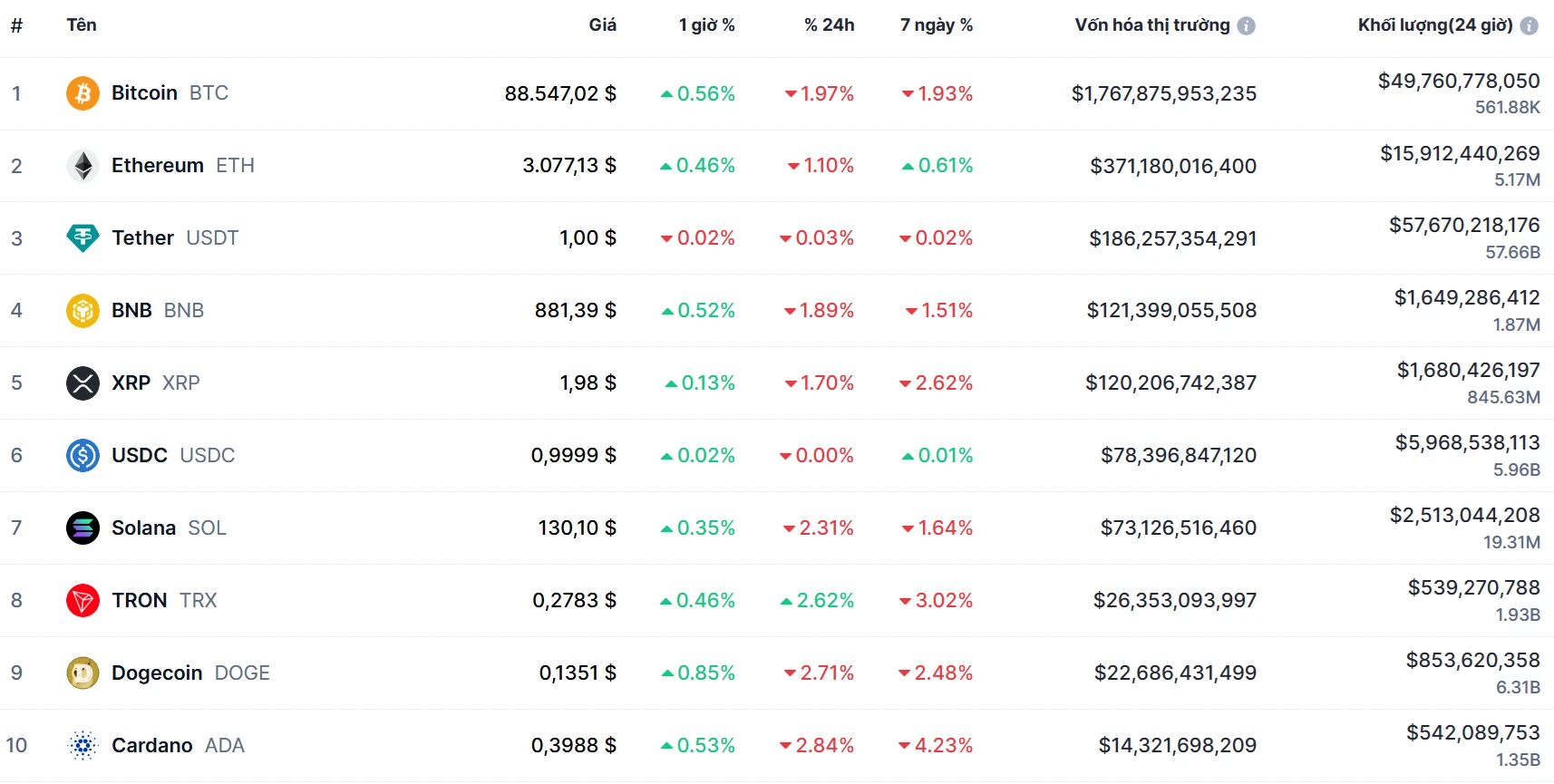 Biến động của Top 10 đồng coin lớn nhất thế giới