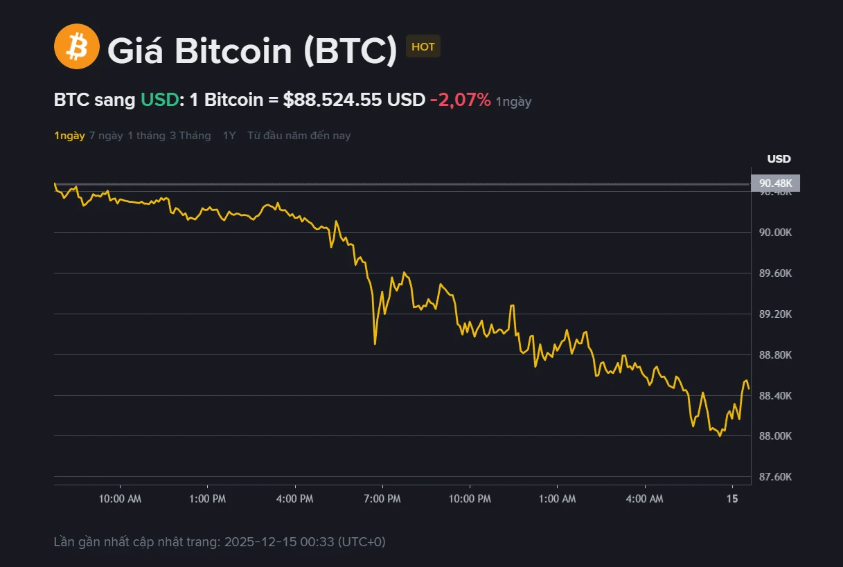 Sáng 15/12, Bitcoin (BTC) giao dịch quanh mức 88.524 USD, giảm hơn 2% so với 24 giờ trước đó. Mức giảm này cho thấy đà hồi phục ngắn hạn vẫn thiếu bền vững, trong bối cảnh thị trường chưa xuất hiện lực cầu đủ mạnh để kéo giá quay trở lại các vùng cao hơn. Với vốn hóa xấp xỉ 1.767 tỉ USD và khối lượng giao dịch 24 giờ đạt gần 50 tỉ USD, Bitcoin tiếp tục giữ vai trò chi phối toàn thị trường nhưng động lực tăng trưởng đang có dấu hiệu suy yếu.
