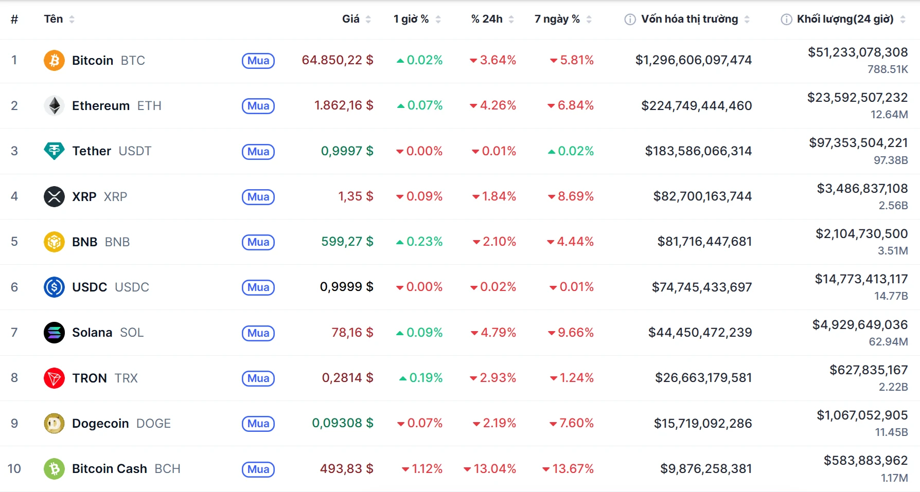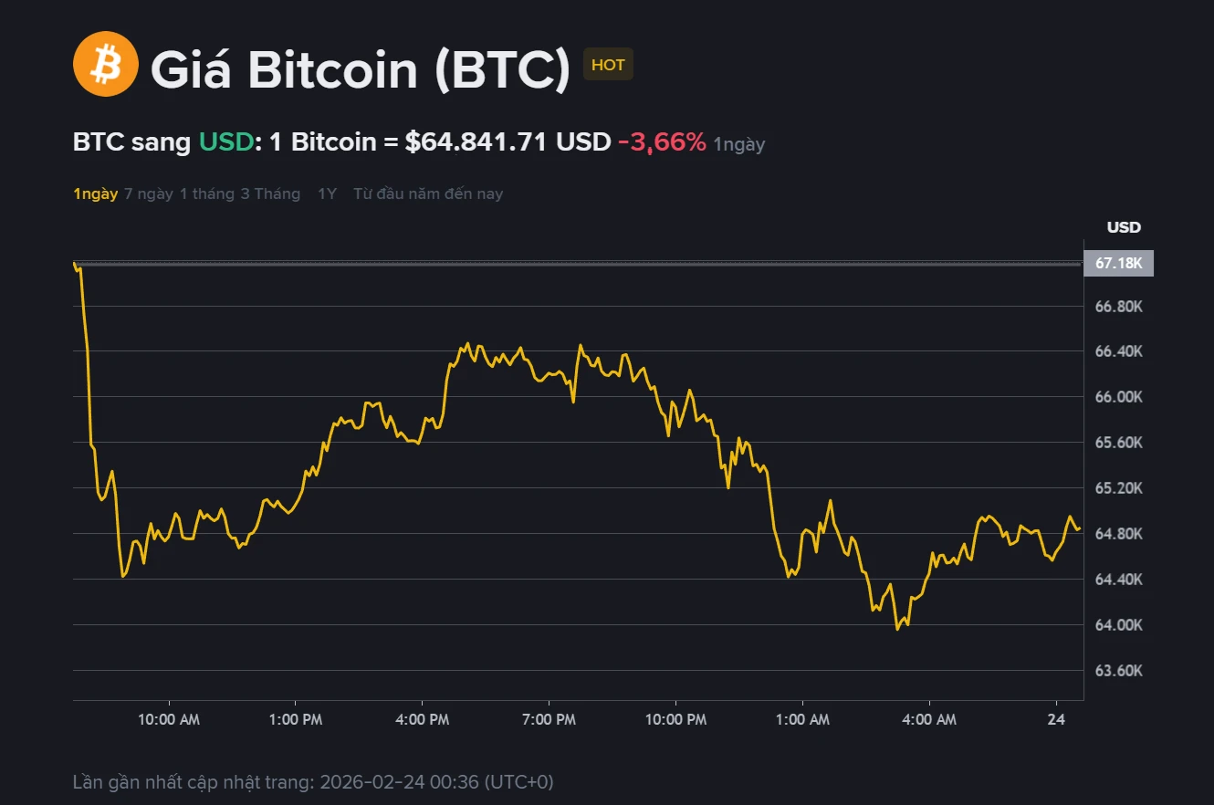 Tính đến đầu ngày 24/2, Bitcoin giao dịch quanh ngưỡng 64.841 USD, giảm 3,66% trong vòng 24 giờ. Dù chịu áp lực bán ra, đồng tiền mã hóa lớn nhất thế giới vẫn duy trì vốn hóa thị trường ở mức khoảng 1.296 tỉ USD, với khối lượng giao dịch trong ngày đạt hơn 50 tỉ USD.