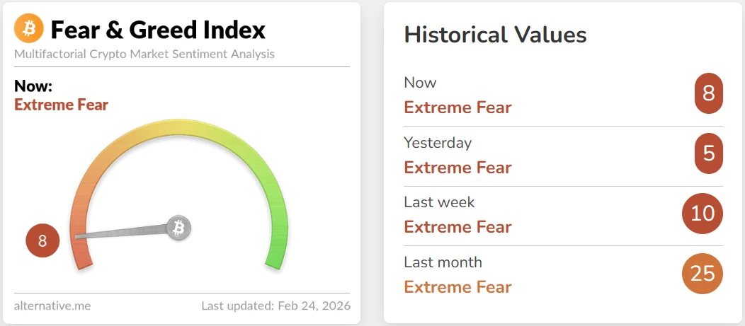 Chỉ số Sợ hãi & Tham lam (Fear & Greed Index) của thị trường tiền mã hóa ngày 24.2 ghi nhận mức 8 điểm - Extreme Fear (sợ hãi tột độ), cho thấy tâm lý bi quan vẫn đang bao trùm thị trường tiền mã hóa.