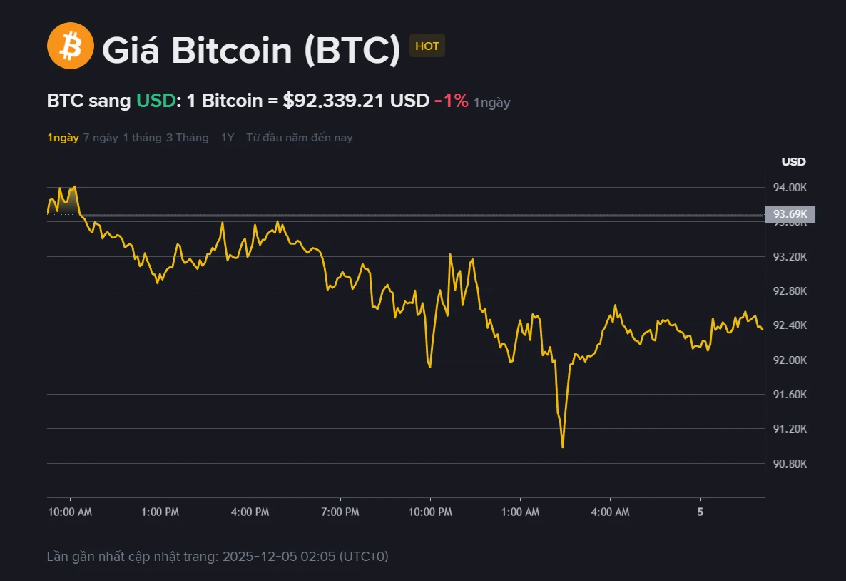 Sáng 5/12, giá Bitcoin (BTC) được ghi nhận quanh mức 92.339 USD, tương ứng vốn hóa khoảng 1.842 tỉ USD, giảm 1% trong 24 giờ gần nhất. Trong phiên giao dịch ngày 4/12, BTC tiếp tục biến động mạnh trong biên độ 91.000 – 94.000 USD, thể hiện sự giằng co rõ rệt giữa hai phe mua – bán.