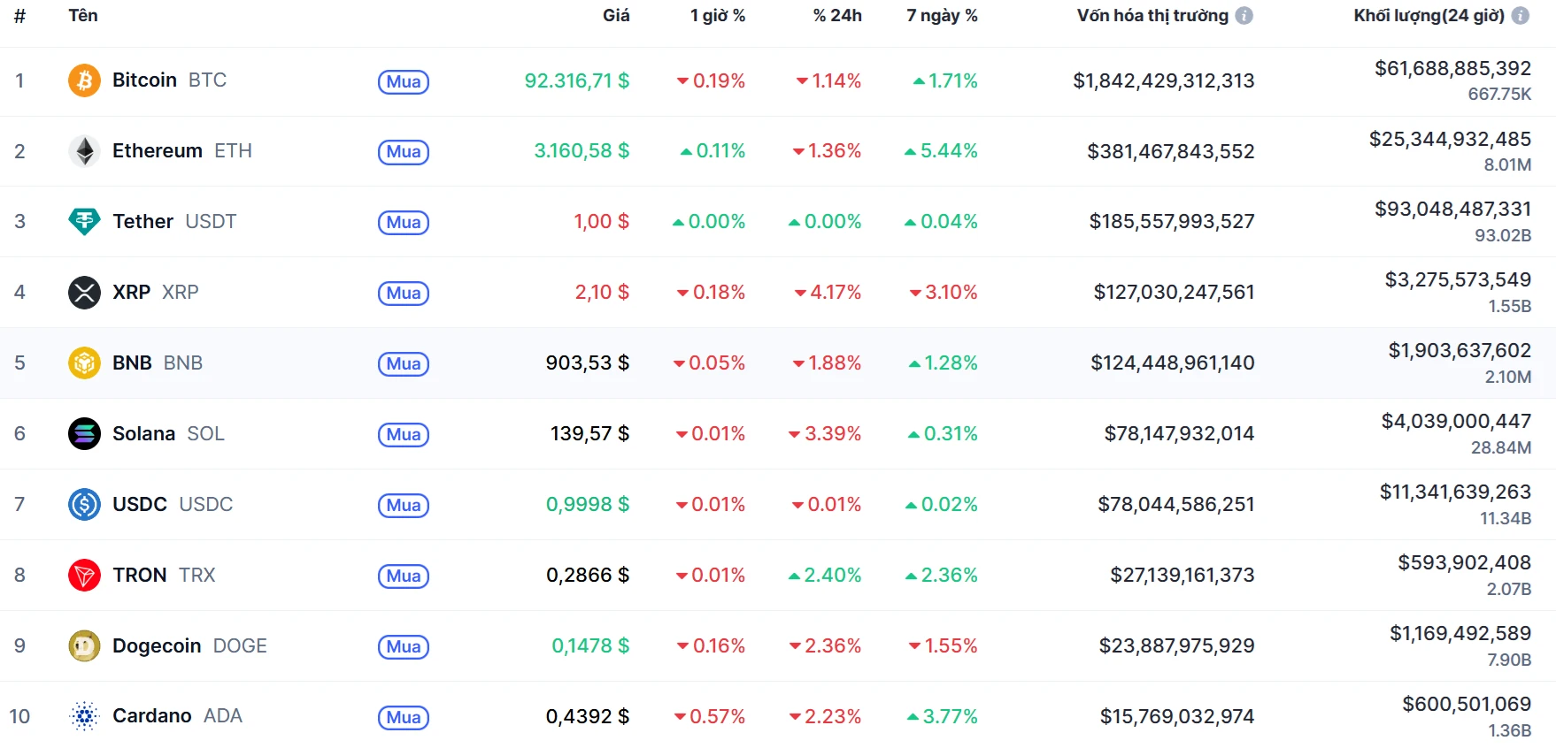 Biến động của Top 10 đồng coin lớn nhất thế giới