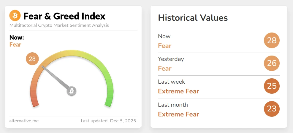Chỉ số Fear & Greed Index ngày 5/12 ghi nhận 28 điểm, vẫn trong vùng Fear – sợ hãi, nhưng đã tăng nhẹ so với hôm qua (26 điểm). So với tuần trước khi chỉ số rơi xuống mức 25 điểm – Extreme Fear, thị trường đã thoát khỏi giai đoạn hoảng loạn sâu, cho thấy tâm lý nhà đầu tư đang ổn định dần.