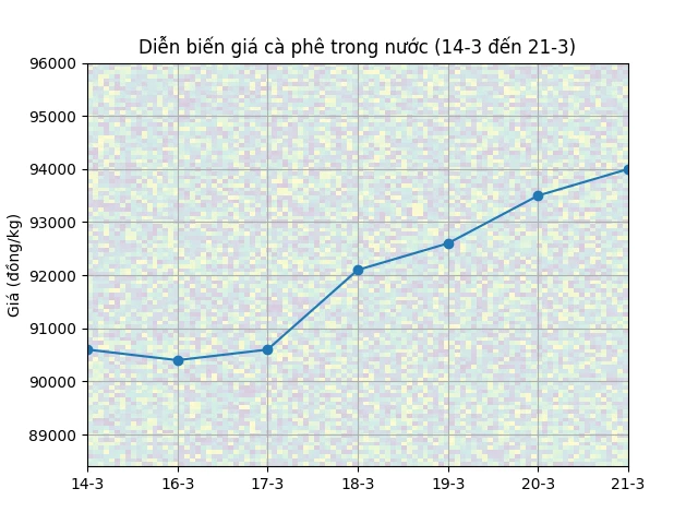 Hôm nay 22-3, giá cà phê trong nước mới nhất bình quân ở mức 94.000 đồng/kg, tăng 3.400 đồng/kg, tương đương 3,75% so với hôm trước.