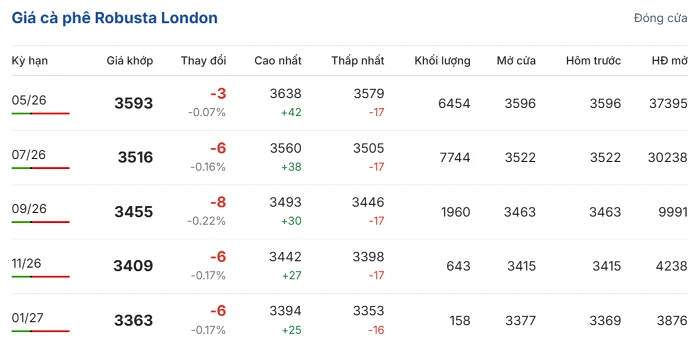 Kết thúc phiên giao dịch ngày 27/3, giá cà phê robusta kỳ hạn tháng 5/2026 trên sàn London gần như đi ngang so với phiên trước, chỉ giảm 0,07% (tương đương 3 USD/tấn), xuống còn 3.593 USD/tấn. Hợp đồng giao tháng 7/2026 cũng giảm nhẹ 0,16% (6 USD/tấn), còn 3.516 USD/tấn.